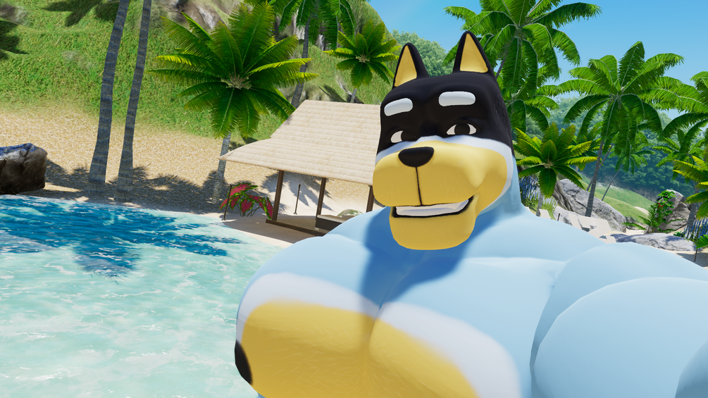 VRChat avatar of everyone's favourite aussie dad; Bandit Heeler! Includes belly, chest, and ear phys bones with a 4 expression puppet wheel to boot!